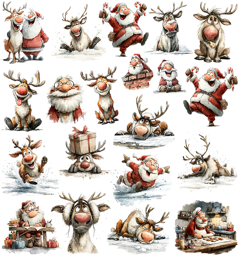 Mit dem UV-DTF Stickerbogen Weihnachten Santa & Rentiere bringst du pure Weihnachtsfreude auf deine Projekte! Die charmanten Sticker mit liebevoll illustrierten Weihnachtsmännern und Rentieren sind perfekt zum Verzieren von Gläsern, Tassen, Dosen, Geschenken, Karten und weihnachtlichen Dekorationen.