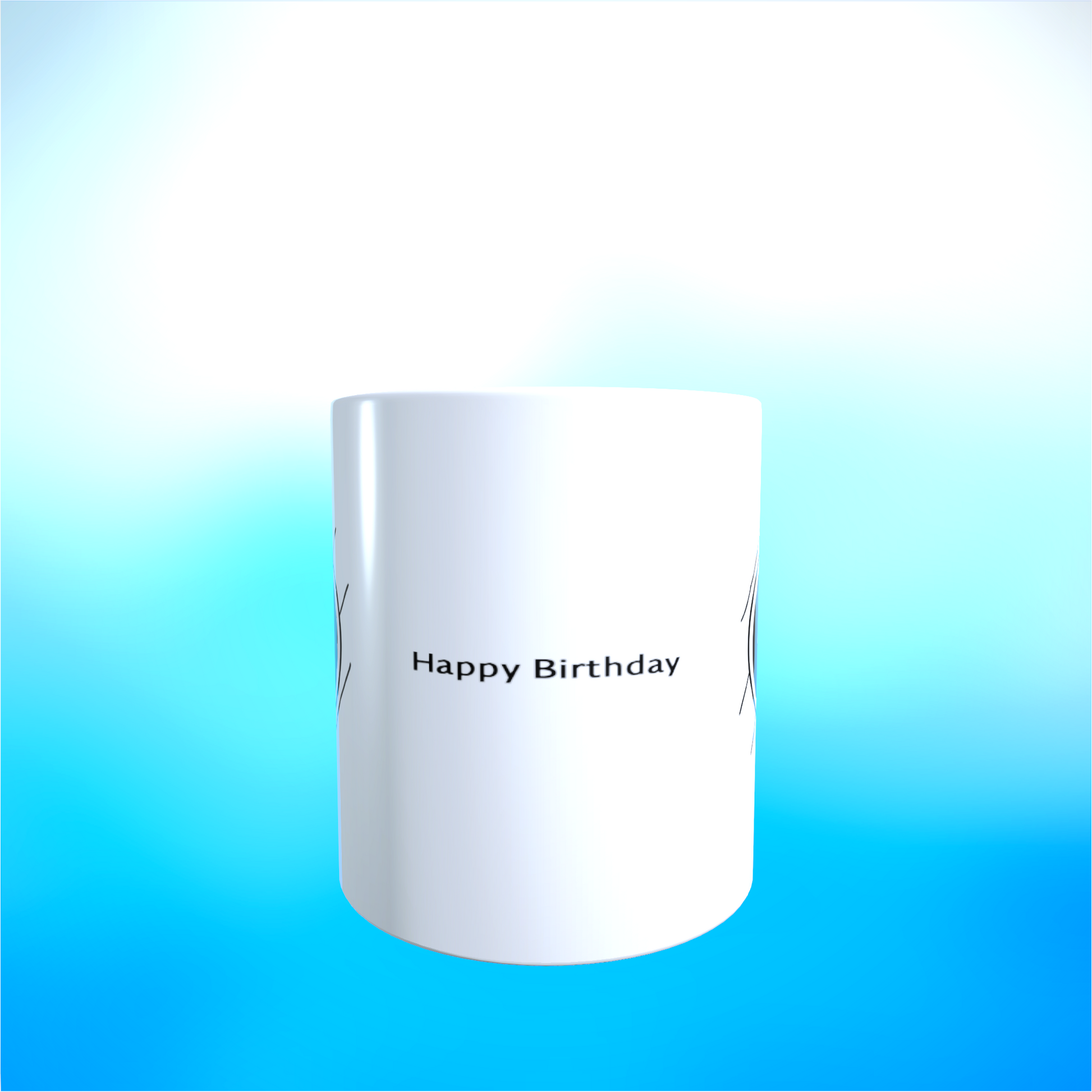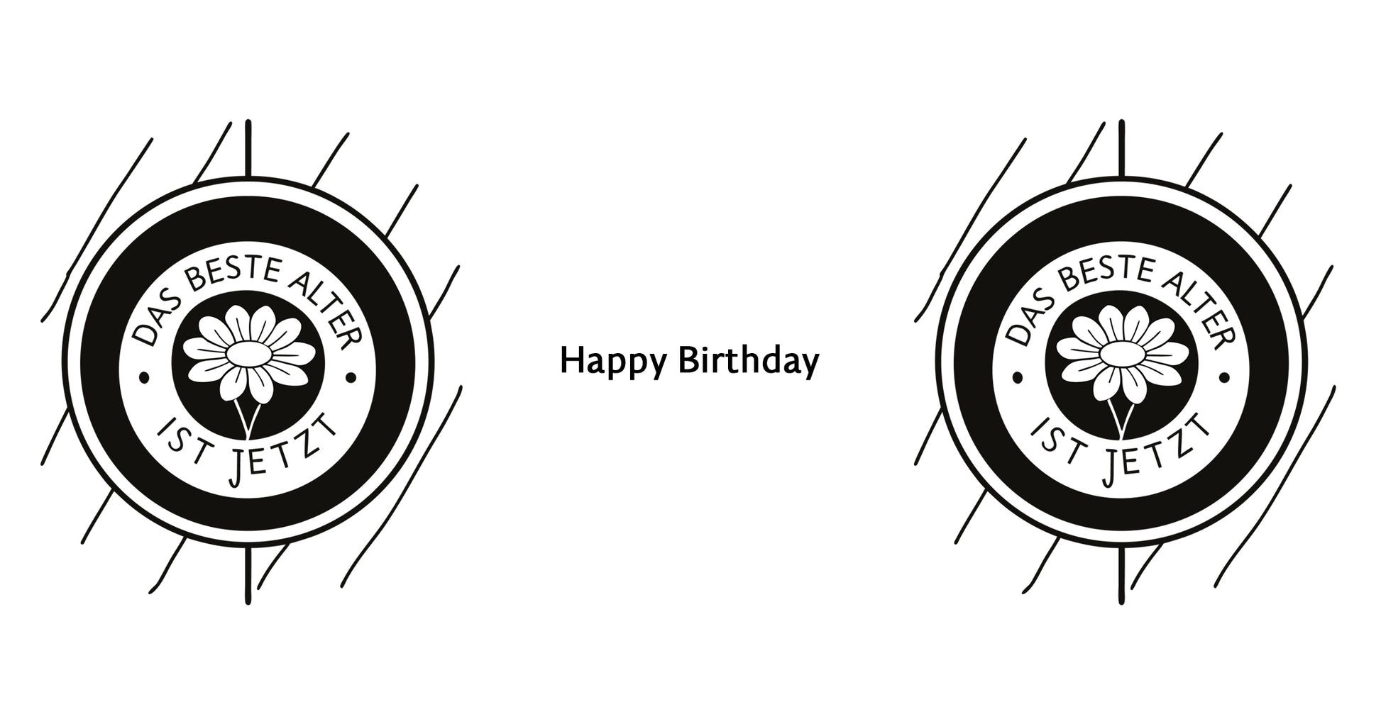 Die Tasse zeigt das kreisförmige Motiv "Das beste Alter ist jetzt" beidseitig und den Text "Happy Birthday" mittig. Sie ist gleichermaßen für Rechts- und Linkshänder*innen geeignet.