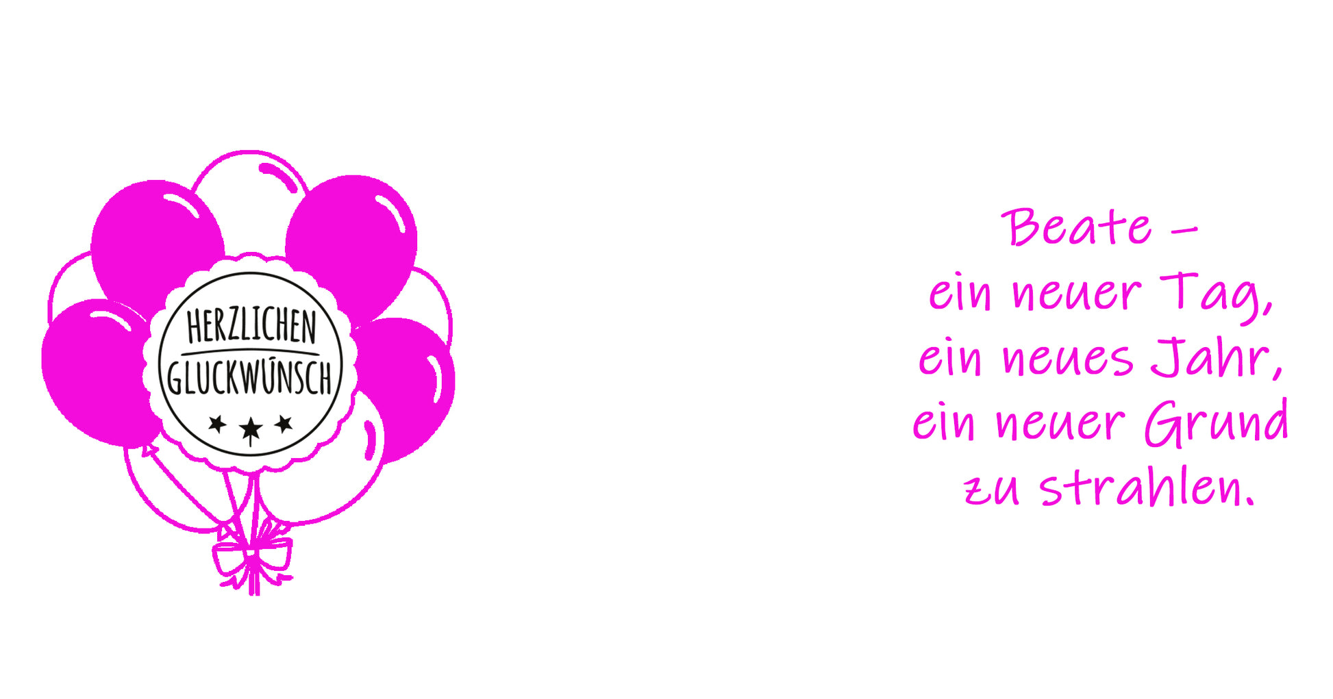 In der personalisierten Variante kann zusätzlich der Name ergänzt werden, zum Beispiel "Beate – ein neuer Tag, ein neues Jahr, ein neuer Grund zu strahlen." oder "Marcel – ein neuer Tag, ein neues Jahr, ein neuer Grund zu strahlen."