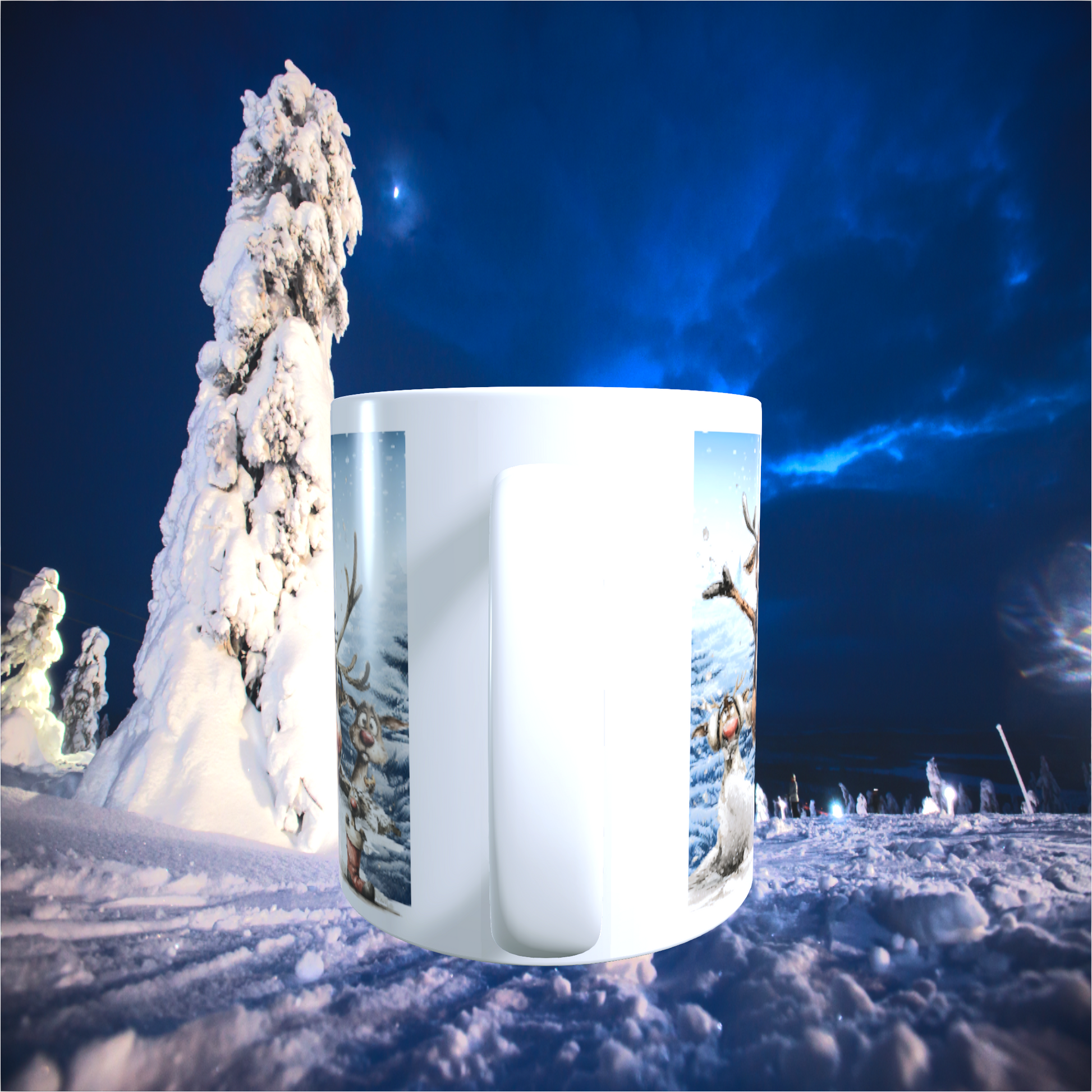 Beidseitig bedruckte Tasse mit winterlichem Rentiermotiv und Schriftzug „Schöne Bescherung“.